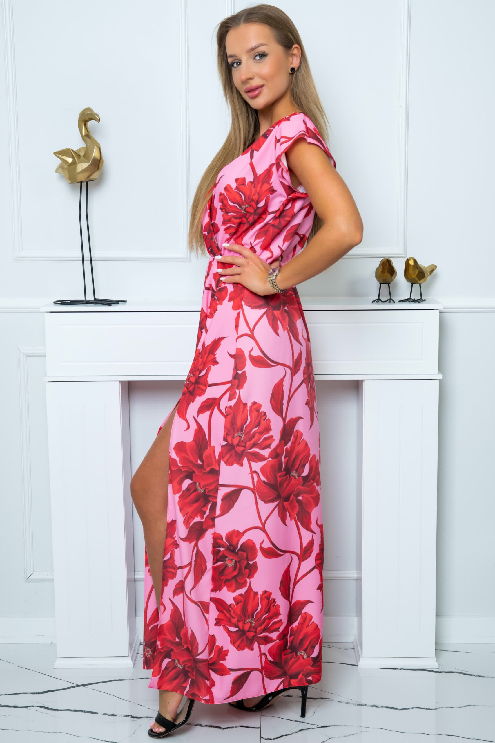 Długa sukienka z rozporkiem, gumką w pasie i szerokimi rękawami w kwiecisty, pełen życia wzór to doskonały wybór. Połączenie eleganckiego kroju z wyrazistym deseniem podkreśli Twój styl i doda Ci niepowtarzalnego uroku. To kreacja, w której z pewnością przyciągniesz spojrzenia i poczujesz się wyjątkowo.